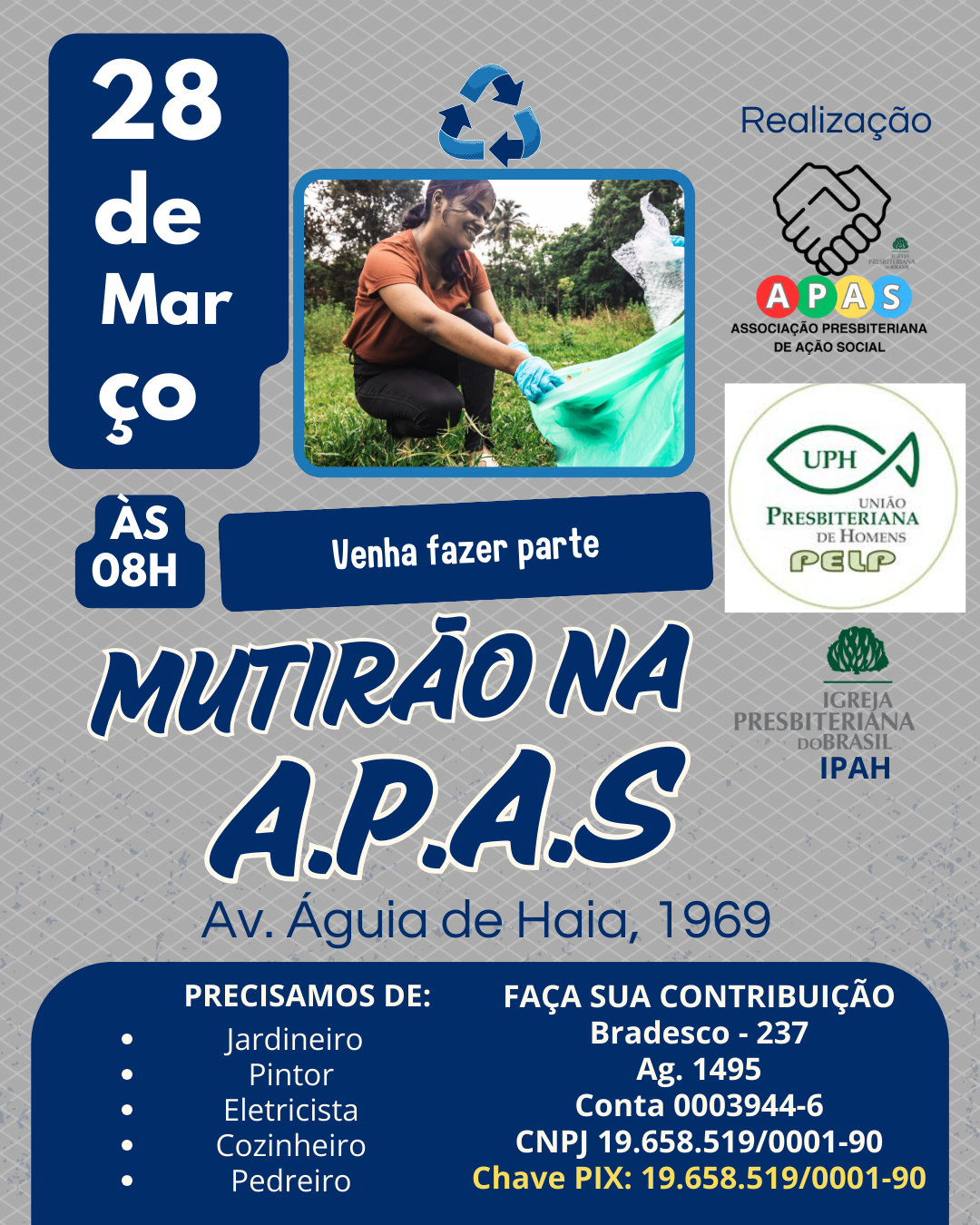 A APAS – Associação Presbiteriana de Ação Social é uma entidade sem fins lucrativos, criada e mantida pela Igreja Presbiteriana em Águia de Haia. Nossa organização nasceu de um compromisso profundo com o bem-estar do próximo, fundamentado em valores cristãos, e voltado para o desenvolvimento integral de pessoas em situação de vulnerabilidade. Nossa Missão: Buscamos desenvolver e divulgar projetos que promovam o desenvolvimento integral do ser humano, especialmente todos que se encontra em estado de vulnerabilidade social. Acreditamos que, por meio de práticas educacionais, podemos contribuir para a formação de cidadãos plenos e engajados na construção de uma sociedade mais justa. Nossa Visão: A APAS acredita que cada ser humano, como criação de Deus, é digno de respeito. Nossa abordagem é integral, voltada para o cuidado físico, psíquico e espiritual, sempre com o objetivo de sermos agentes de transformação na sociedade. Nosso Compromisso: • Promover o conhecimento de Deus, o Criador de todas as coisas. • Construir um ambiente de amor e facilidades, onde cada indivíduo é valorizado. • Desenvolver a disciplina e o crescimento integral – intelectual, físico, emocional e espiritual. • Estabelecer parcerias que fortaleçam nosso trabalho e ampliem nosso alcance • Servir com transparência e integridade, seguindo os princípios cristãos de moral e ética. • Investir em capacitação contínua, garantindo que nossa equipe esteja preparada para servir com excelência. Temos certeza de que, juntos, podemos realizar grandes transformações. A APAS é uma porta aberta para todos que desejam contribuir e fazer parte de uma ação social efetiva e comprometida com o próximo. Contamos com o apoio da comunidade e de parceiros para seguirmos com essa missão. Com gratidão, APAS – Associação Presbiteriana de Ação Social